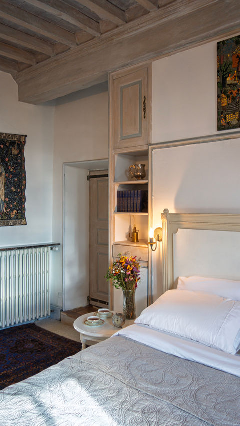 The Chateau includes three bedrooms on two upper floors, each with its own bathroom. Every bedroom is spacious and comes with period furniture and great light and views.